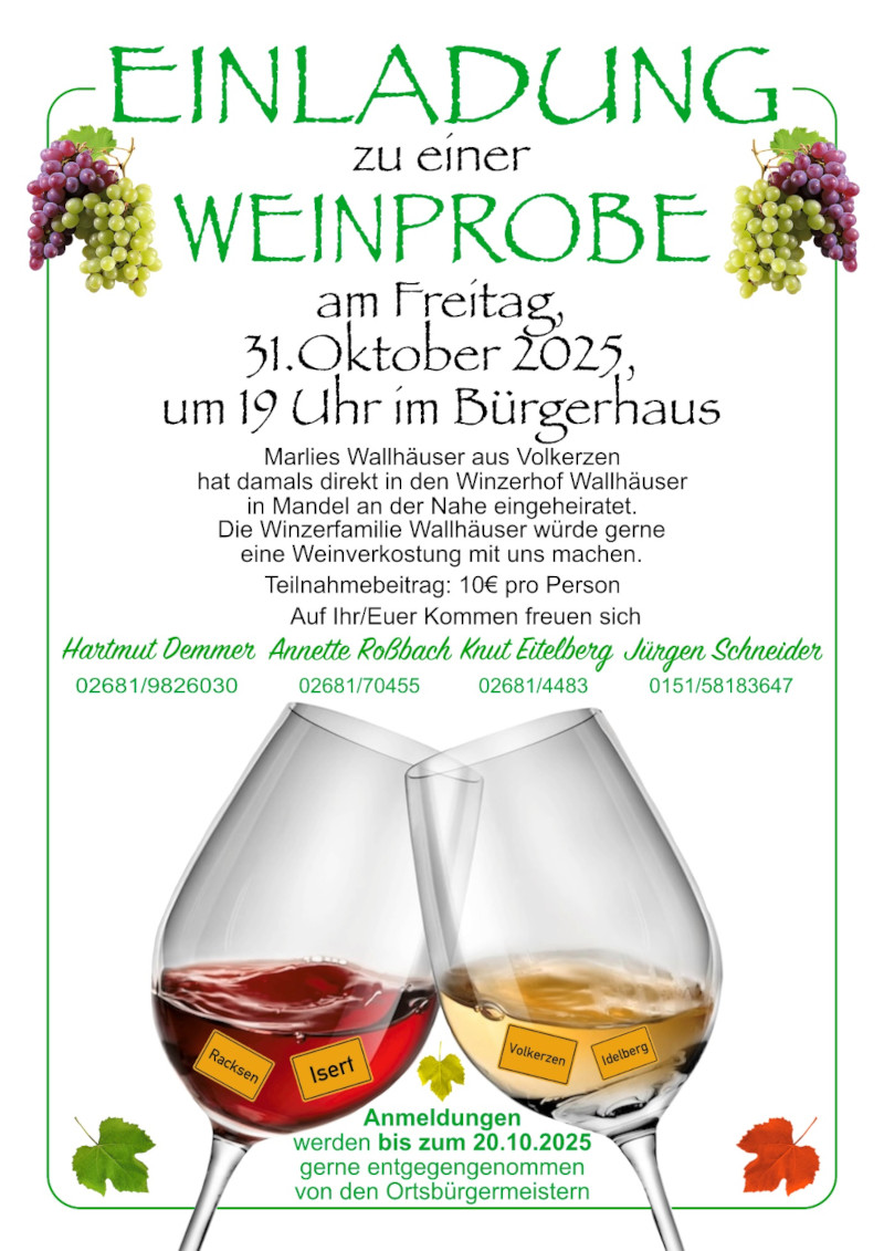 Am Freitag 31. Oktober ab 19 Uhr im Bürgerhaus. Die Winzerfamilie Wallhäuser aus Mandel an der Nahe veranstaltet eine Weinverkostung mit uns. Der Teilnamebeitrag ist 10 EUR pro Person. Auf euer Erscheinen freuen sich die Ortsbürgermeister. Anmeldungen bis zum 20.10. bei: